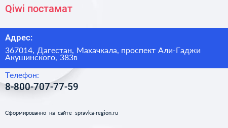 Qiwi, постамат по адресу 367014, Дагестан, Махачкала, проспект Али-Гаджи Акушинского, 383в в дальнейшем Организация, размещена в следующих категориях: