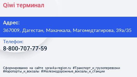 Qiwi, терминал по адресу 367009, Дагестан, Махачкала, Магомедтагирова, 39а/35 в дальнейшем Организация, размещена в следующих категориях: