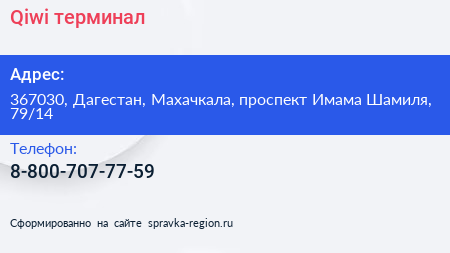 Qiwi, терминал по адресу 367030, Дагестан, Махачкала, проспект Имама Шамиля, 79/14 в дальнейшем Организация, размещена в следующих категориях: