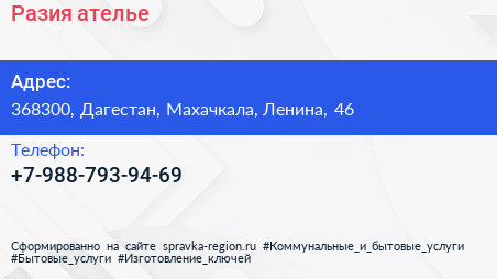 Разия, ателье по адресу 368300, Дагестан, Махачкала, Ленина, 46 в дальнейшем Организация, размещена в следующих категориях: