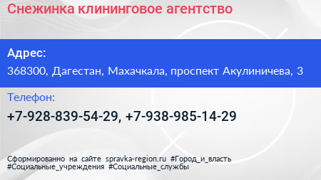 Снежинка, клининговое агентство по адресу 368300, Дагестан, Махачкала, проспект Акулиничева, 3 в дальнейшем Организация, размещена в следующих категориях: