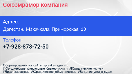 Союзмрамор, компания по адресу Дагестан, Махачкала, Приморская, 13 в дальнейшем Организация, размещена в следующих категориях: