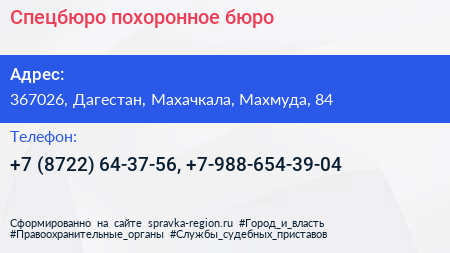 Спецбюро, похоронное бюро по адресу 367026, Дагестан, Махачкала, Махмуда, 84 в дальнейшем Организация, размещена в следующих категориях: