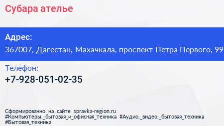 Субара, ателье по адресу 367007, Дагестан, Махачкала, проспект Петра Первого, 99 в дальнейшем Организация, размещена в следующих категориях: