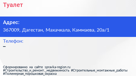Туалет по адресу 367009, Дагестан, Махачкала, Каммаева, 20а/1 в дальнейшем Организация, размещена в следующих категориях: