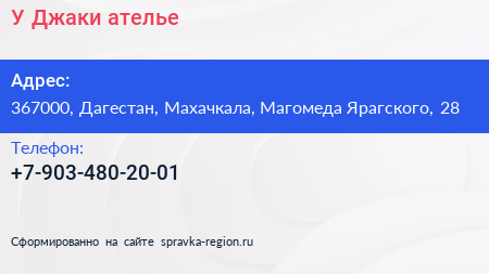 У Джаки, ателье по адресу 367000, Дагестан, Махачкала, Магомеда Ярагского, 28 в дальнейшем Организация, размещена в следующих категориях: