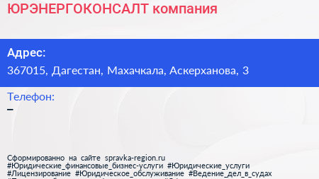 ЮРЭНЕРГОКОНСАЛТ, компания по адресу 367015, Дагестан, Махачкала, Аскерханова, 3 в дальнейшем Организация, размещена в следующих категориях:
