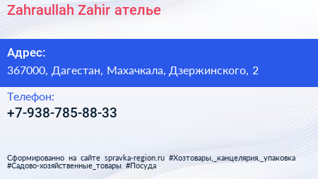 Zahraullah Zahir, ателье по адресу 367000, Дагестан, Махачкала, Дзержинского, 2 в дальнейшем Организация, размещена в следующих категориях: