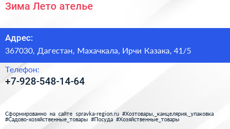 Зима Лето, ателье по адресу 367030, Дагестан, Махачкала, Ирчи Казака, 41/5 в дальнейшем Организация, размещена в следующих категориях: