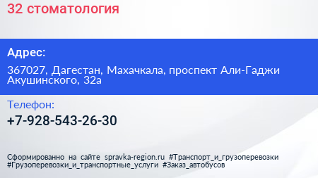 32, стоматология по адресу 367027, Дагестан, Махачкала, проспект Али-Гаджи Акушинского, 32а в дальнейшем Организация, размещена в следующих категориях: