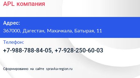 APL, компания по адресу 367000, Дагестан, Махачкала, Батырая, 11 в дальнейшем Организация, размещена в следующих категориях: