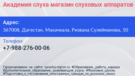Академия слуха, магазин слуховых аппаратов по адресу 367008, Дагестан, Махачкала, Ризвана Сулейманова, 50 в дальнейшем Организация, размещена в следующих категориях:
