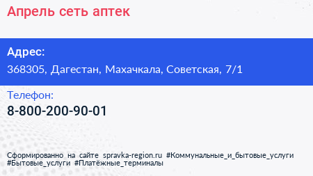 Апрель, сеть аптек по адресу 368305, Дагестан, Махачкала, Советская, 7/1 в дальнейшем Организация, размещена в следующих категориях: