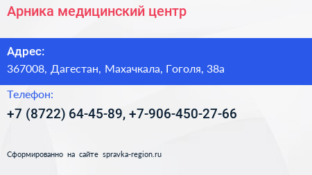 Арника, медицинский центр по адресу 367008, Дагестан, Махачкала, Гоголя, 38а в дальнейшем Организация, размещена в следующих категориях: