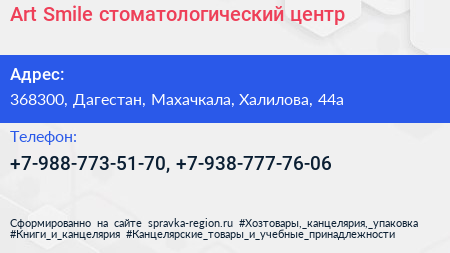 Art Smile, стоматологический центр по адресу 368300, Дагестан, Махачкала, Халилова, 44а в дальнейшем Организация, размещена в следующих категориях: