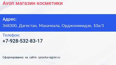 Avon, магазин косметики по адресу 368300, Дагестан, Махачкала, Орджоникидзе, 10а/1 в дальнейшем Организация, размещена в следующих категориях: