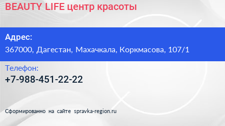 BEAUTY LIFE, центр красоты по адресу 367000, Дагестан, Махачкала, Коркмасова, 107/1 в дальнейшем Организация, размещена в следующих категориях: