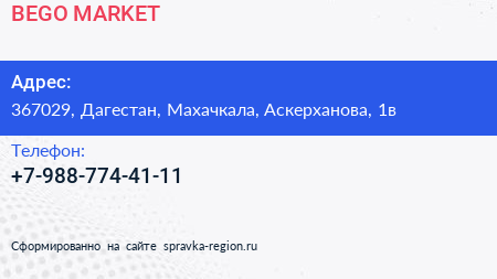 BEGO MARKET по адресу 367029, Дагестан, Махачкала, Аскерханова, 1в в дальнейшем Организация, размещена в следующих категориях: