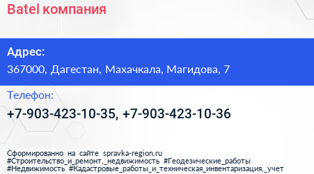 Batel, компания по адресу 367000, Дагестан, Махачкала, Магидова, 7 в дальнейшем Организация, размещена в следующих категориях: