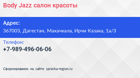 Body Jazz, салон красоты по адресу 367003, Дагестан, Махачкала, Ирчи Казака, 1а/3 в дальнейшем Организация, размещена в следующих категориях: