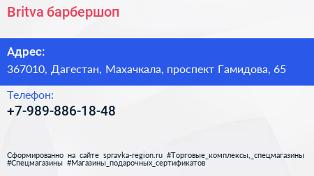 Britva, барбершоп по адресу 367010, Дагестан, Махачкала, проспект Гамидова, 65 в дальнейшем Организация, размещена в следующих категориях: