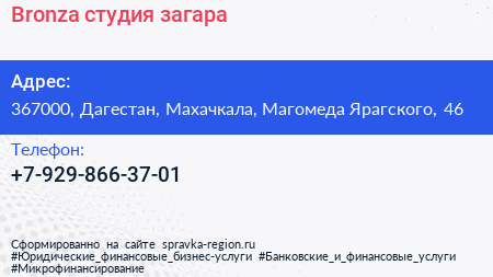 Bronza, студия загара по адресу 367000, Дагестан, Махачкала, Магомеда Ярагского, 46 в дальнейшем Организация, размещена в следующих категориях: