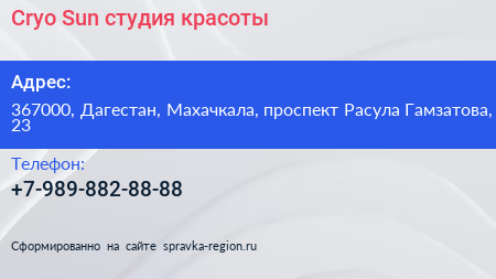 Cryo Sun, студия красоты по адресу 367000, Дагестан, Махачкала, проспект Расула Гамзатова, 23 в дальнейшем Организация, размещена в следующих категориях: