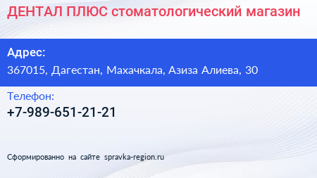 ДЕНТАЛ ПЛЮС, стоматологический магазин по адресу 367015, Дагестан, Махачкала, Азиза Алиева, 30 в дальнейшем Организация, размещена в следующих категориях: