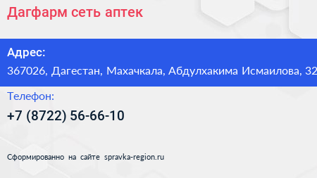 Дагфарм, сеть аптек по адресу 367026, Дагестан, Махачкала, Абдулхакима Исмаилова, 32 в дальнейшем Организация, размещена в следующих категориях: