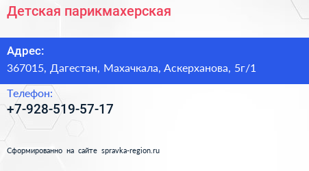Детская парикмахерская по адресу 367015, Дагестан, Махачкала, Аскерханова, 5г/1 в дальнейшем Организация, размещена в следующих категориях: