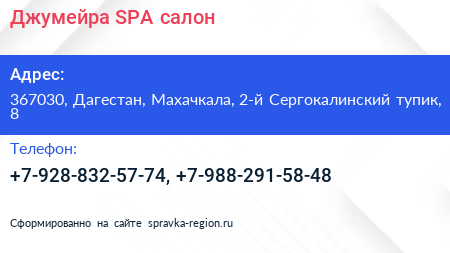 Джумейра, SPA-салон по адресу 367030, Дагестан, Махачкала, 2-й Сергокалинский тупик, 8 в дальнейшем Организация, размещена в следующих категориях: