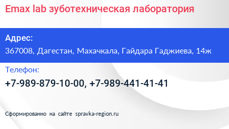 Emax.lab, зуботехническая лаборатория по адресу 367008, Дагестан, Махачкала, Гайдара Гаджиева, 14ж в дальнейшем Организация, размещена в следующих категориях: