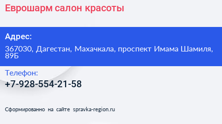 Еврошарм, салон красоты по адресу 367030, Дагестан, Махачкала, проспект Имама Шамиля, 89Б в дальнейшем Организация, размещена в следующих категориях: