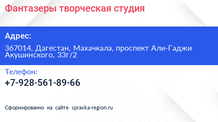 Фантазеры, творческая студия по адресу 367014, Дагестан, Махачкала, проспект Али-Гаджи Акушинского, 33г/2 в дальнейшем Организация, размещена в следующих категориях: