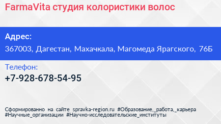 FarmaVita, студия колористики волос по адресу 367003, Дагестан, Махачкала, Магомеда Ярагского, 76Б в дальнейшем Организация, размещена в следующих категориях: