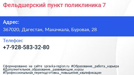 Фельдшерский пункт, поликлиника №7 по адресу 367020, Дагестан, Махачкала, Буровая, 28 в дальнейшем Организация, размещена в следующих категориях: