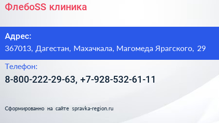 ФлебоSS, клиника по адресу 367013, Дагестан, Махачкала, Магомеда Ярагского, 29 в дальнейшем Организация, размещена в следующих категориях: