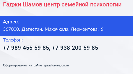 Гаджи Шамов, центр семейной психологии по адресу 367000, Дагестан, Махачкала, Лермонтова, 6 в дальнейшем Организация, размещена в следующих категориях: