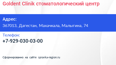 Goldent Clinik, стоматологический центр по адресу 367013, Дагестан, Махачкала, Малыгина, 74 в дальнейшем Организация, размещена в следующих категориях: