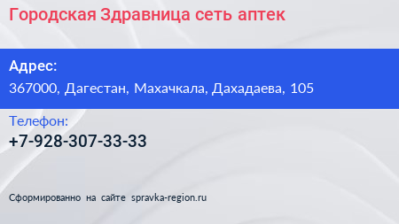 Городская Здравница, сеть аптек по адресу 367000, Дагестан, Махачкала, Дахадаева, 105 в дальнейшем Организация, размещена в следующих категориях: