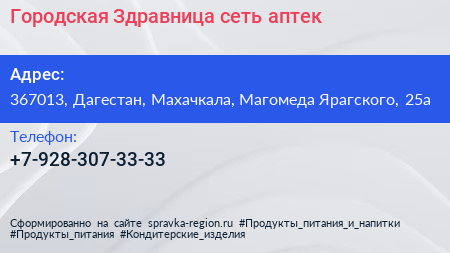 Городская Здравница, сеть аптек по адресу 367013, Дагестан, Махачкала, Магомеда Ярагского, 25а в дальнейшем Организация, размещена в следующих категориях:
