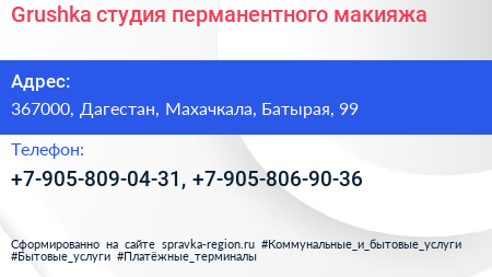 Grushka, студия перманентного макияжа по адресу 367000, Дагестан, Махачкала, Батырая, 99 в дальнейшем Организация, размещена в следующих категориях:
