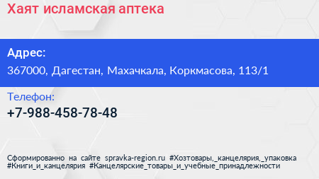 Хаят, исламская аптека по адресу 367000, Дагестан, Махачкала, Коркмасова, 113/1 в дальнейшем Организация, размещена в следующих категориях: