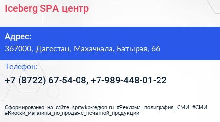 Iceberg, SPA-центр по адресу 367000, Дагестан, Махачкала, Батырая, 66 в дальнейшем Организация, размещена в следующих категориях: