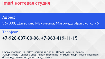 Imart, ногтевая студия по адресу 367003, Дагестан, Махачкала, Магомеда Ярагского, 76 в дальнейшем Организация, размещена в следующих категориях: