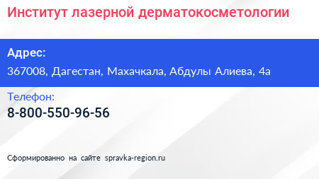 Институт лазерной дерматокосметологии по адресу 367008, Дагестан, Махачкала, Абдулы Алиева, 4а в дальнейшем Организация, размещена в следующих категориях: