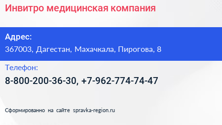 Инвитро, медицинская компания по адресу 367003, Дагестан, Махачкала, Пирогова, 8 в дальнейшем Организация, размещена в следующих категориях: