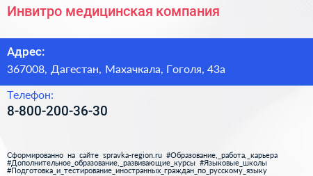 Инвитро, медицинская компания по адресу 367008, Дагестан, Махачкала, Гоголя, 43а в дальнейшем Организация, размещена в следующих категориях: