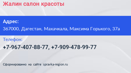 Жалин, салон красоты по адресу 367000, Дагестан, Махачкала, Максима Горького, 37а в дальнейшем Организация, размещена в следующих категориях: