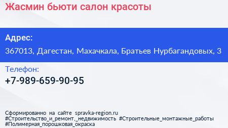 Жасмин бьюти, салон красоты по адресу 367013, Дагестан, Махачкала, Братьев Нурбагандовых, 3 в дальнейшем Организация, размещена в следующих категориях:
